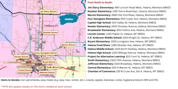 Each school will be a food pantry hub for the Helena Area community, along with the Lincoln Center, and the Chamber of Commerce. Donated items will be used within each school, the Helena Food Share, and for the Kid Packs that Helena Food Share provides HPS. We will update you on the needs of each school as they arise.